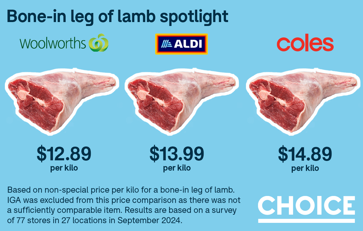 “Coles and Woolworths came equal first nationwide when we looked at the best price for a leg of lamb with specials. Coles and Woolworths both sold a leg of lamb at an average of $12.89 per kilo, while Aldi came in third place at $13.99 per kilo,” says CHOICE CEO, Ashley de Silva.