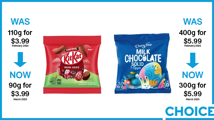 CHOICE has found several examples of Easter shrinkflation, with chocolate Easter eggs from Cadbury, Nestle and supermarket chain Aldi decreasing in size, but increasing or remaining the same in price.
