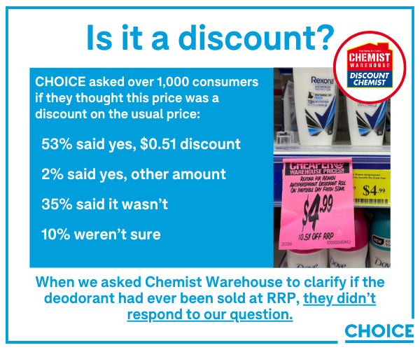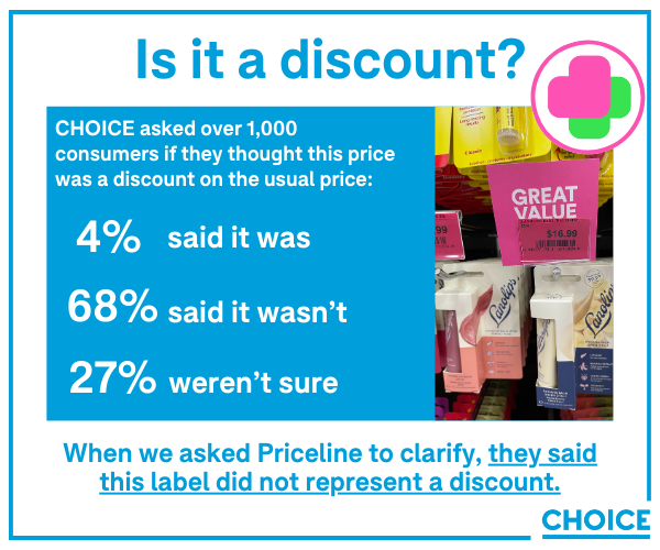 CHOICE asked over 1,000 consumers if they could tell if price tags photographed at Chemist Warehouse, Priceline and Terry White represent a discount on the usual price, and if they could quickly and easily tell if it was a discount or not.