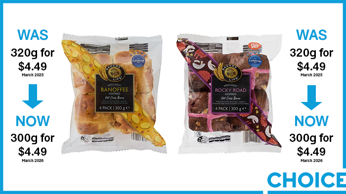 “Hot cross buns have also fallen victim to shrinkflation, with smaller buns now on shelves without any reduction in price. Aldi’s Rocky Road and Banoffee Inspired buns are both 20g lighter than they were this time last year. If you pick up a packet of these novelty buns, you’ll be paying nearly 7% more per 100g than you would have last Easter,” says Kennedy.