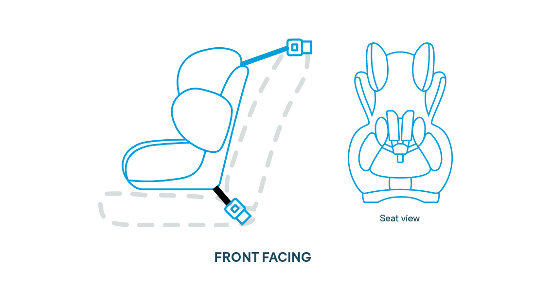 A forward-facing (or front-facing) restraint has its own inbuilt six-point harness for your child. This should be used until your child is at least 4 years old, but can be used for longer if they still fit.
