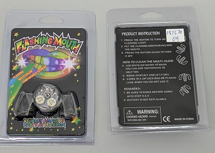 This LED flashing mouth sold on eBay lacked mandatory button battery warning labels.