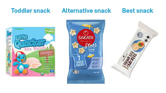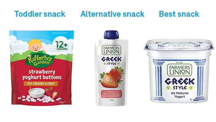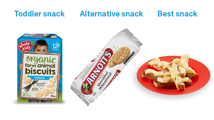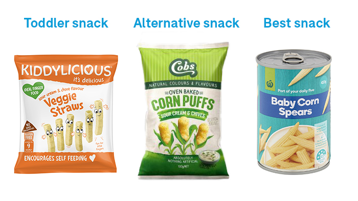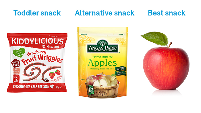 Finally, think twice before heading to the baby and toddler food section of the supermarket. You can often find a healthier – or at least cheaper – snack if you choose from a different aisle. See our examples below.
