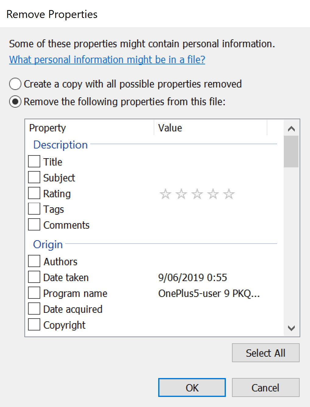 It’s up to you which you choose. If you choose the second option, you can either select types of metadata individually or click Select all. Hit OK to finalise.