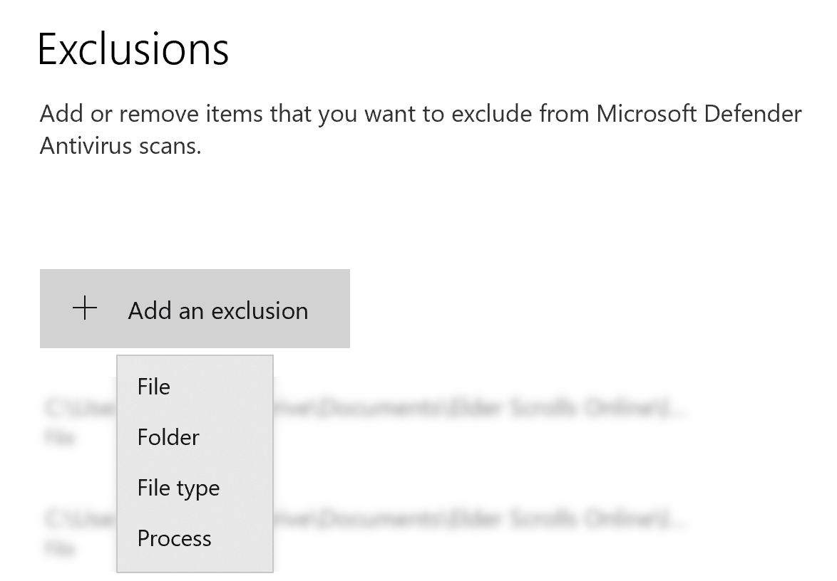 You can set up permanent exclusions for specific files, folders, file types and processes so they’ll never be scanned. Click on Virus & threat protection settings, then scroll down to Add or remove exclusions. Of the four choices, File and Folder are self-explanatory and easy to navigate.