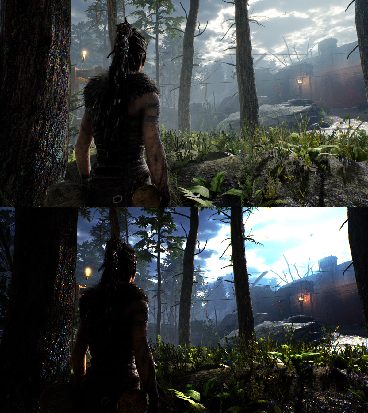 Hellblade: Senua’s Sacrifice with HDR off (top) and HDR on (bottom). The image was scaled to 1200px width before uploading.