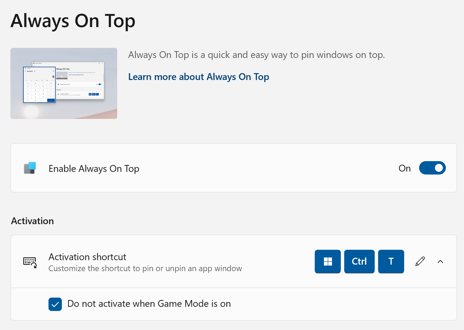 When PowerToys is active, pressing Ctrl + Start key + T will pin the active window so it’s always on top of other programs. The pinned window has a coloured border, which you can disable or visually edit. You can also disable the pin/unpin notification sounds.