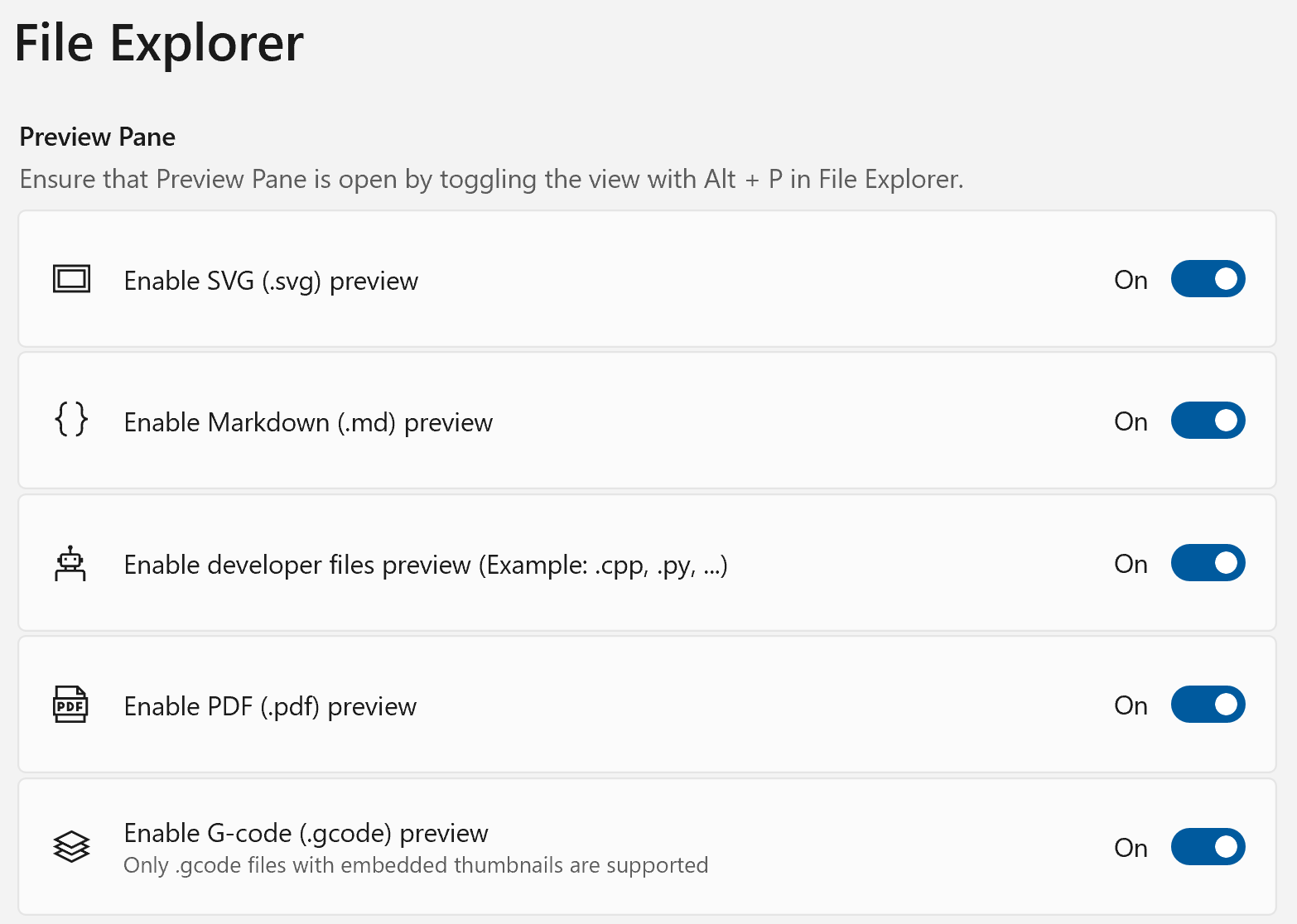 File Explorer add-ons is a bit of a misnomer. Right now, all it does is allow file previews for a wider range of filetypes. Some of the filetypes, such as .pdf, can already preview without PowerToys, but enabling it via PowerToys makes it look slightly cleaner.
