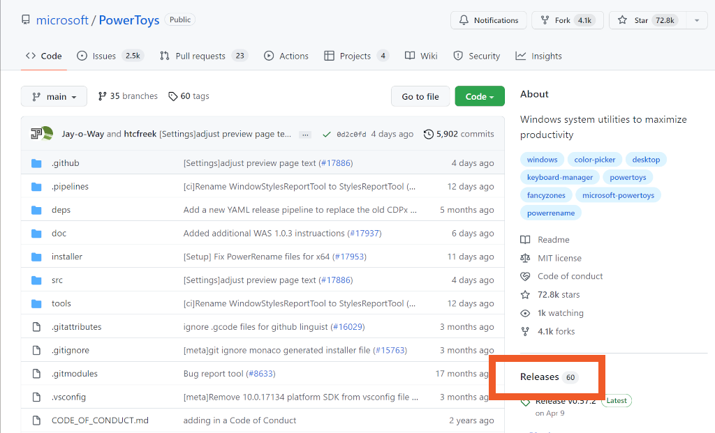 PowerToys is only available from GitHub, a Microsoft-owned website where developers share free and open-source software or code. To download it, go to github.com/microsoft/PowerToys and click Releases on the right side of the page.