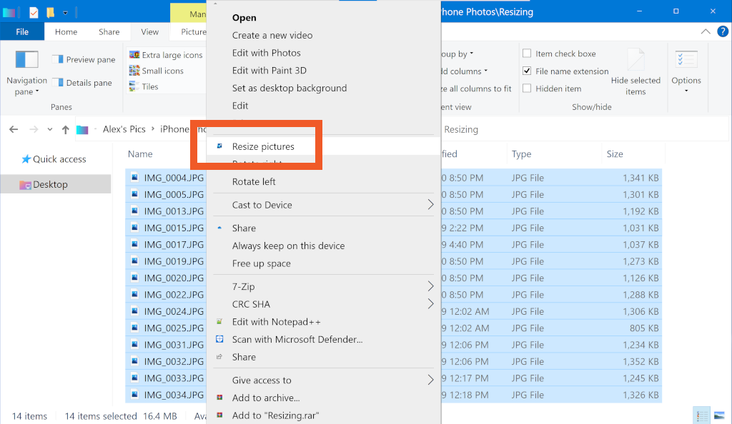 This lets you move and resize images en-masse. Select a group of image files then right-click and select Resize pictures. Copies of the originals will be created in the size you specified (e.g. 854 x 480 pixels).