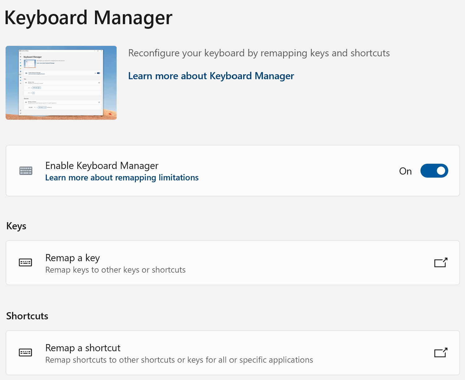 Keyboard Manager lets you remap keyboard keys or system shortcuts. If your Enter key is broken, you can rebind it to right shift (assuming you predominantly use left shift). A numpad key can become a media play/pause button, the screenshot shortcut (Start key + Shift + S) can be remapped to dictation, and more.