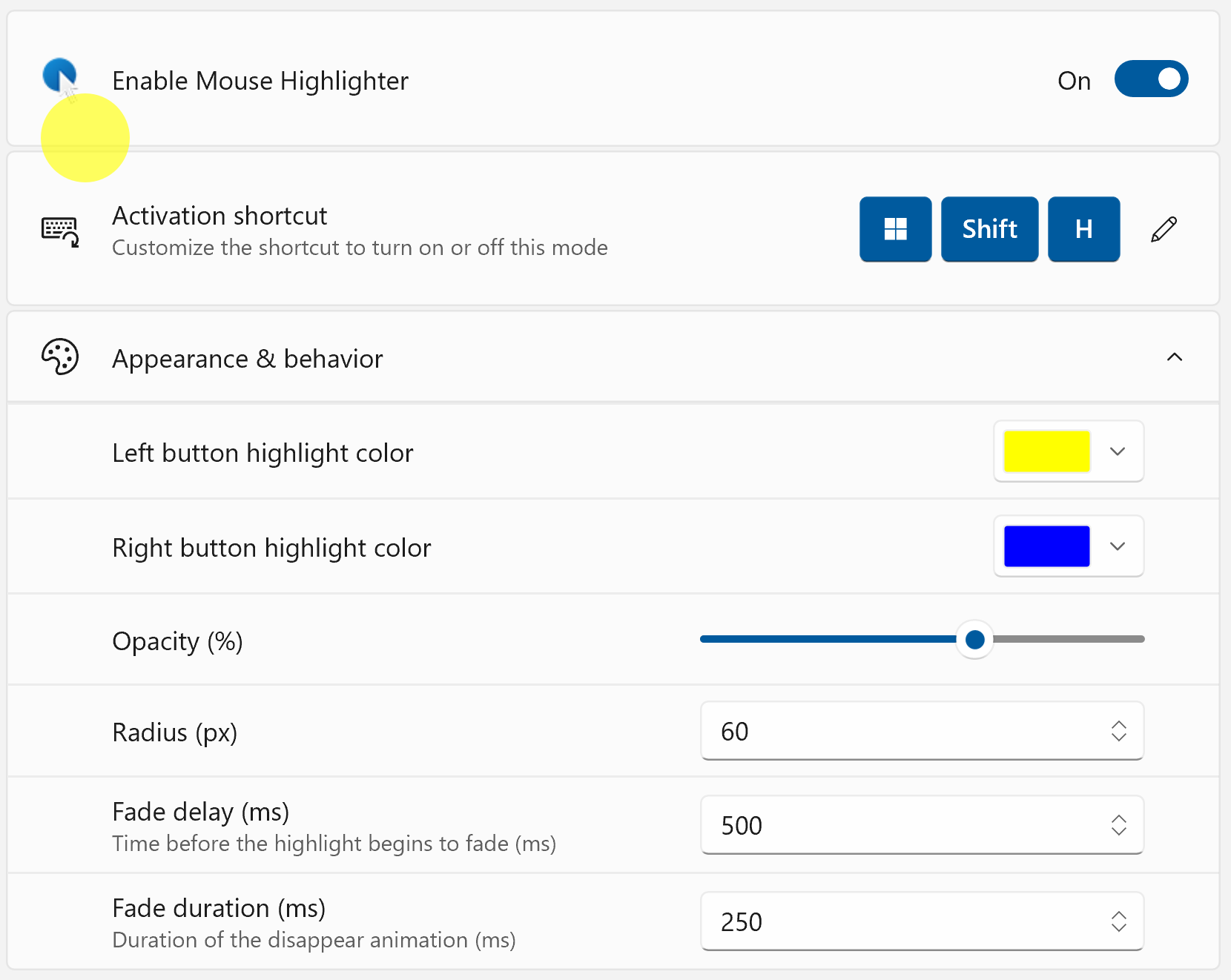 Mouse Highlighter leaves a coloured dot wherever you click, with different colours for the right and left buttons. The next time you click, the dot moves. You can adjust the fade duration and delay of the dot, as well as its colour, radius and opacity. Activate and deactivate Mouse Highlighter by pressing Start key + Shift + H.