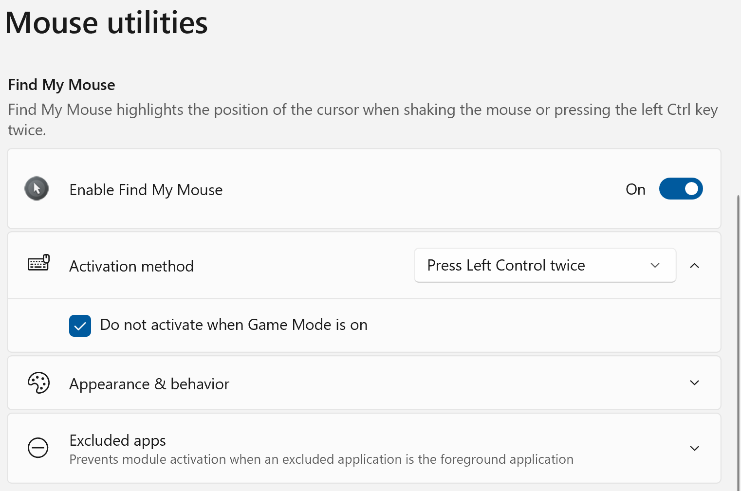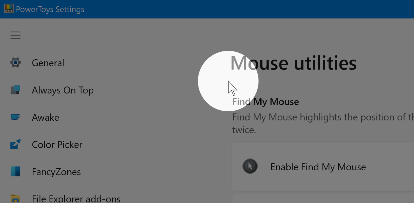 If you ever find yourself shaking your mouse to try and locate the cursor, Find My Mouse is the answer. Once PowerToys is installed, it’s on by default. Press Left Ctrl twice (or change it to Shake your mouse) and the screen will darken everywhere except for a spotlight around your cursor. You can exclude apps individually or have it deactivate while in Game Mode.