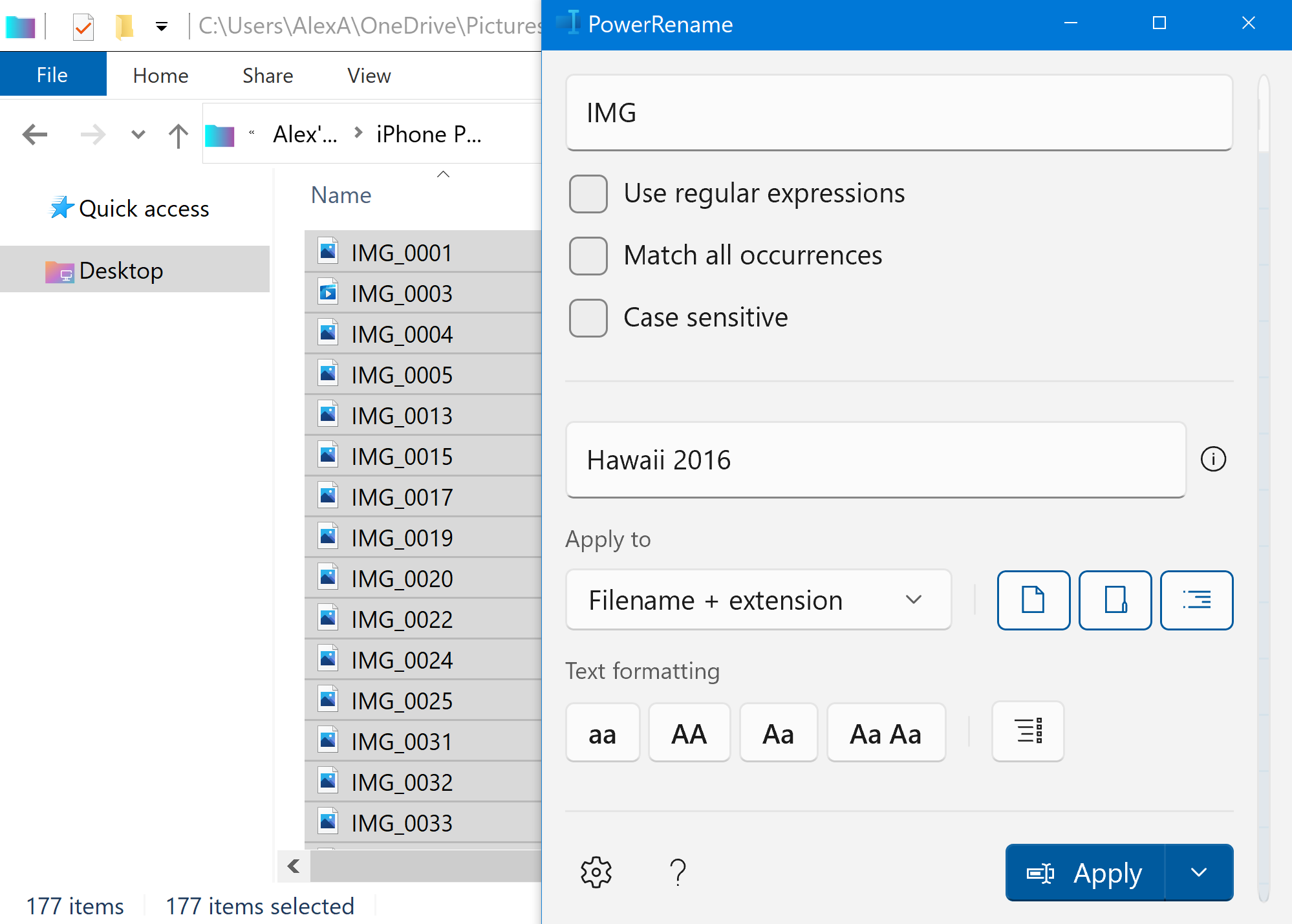 PowerRename can rename files, folders and subfolders en-masse, as long as the original files have identical sections of their name. This is particularly useful for image files you’d like to collate, such as photos from a holiday. For example, a large group of photos might all begin with “IMG” or “DCMI”. It essentially does a find-and-replace, similar to the Word feature.