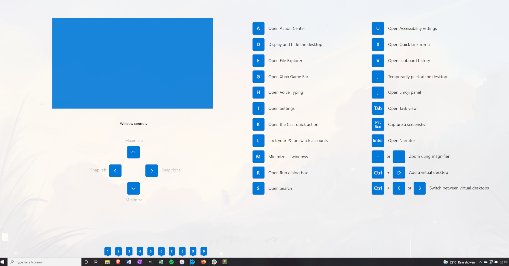 This is a quick way of checking some Windows shortcut commands. Press Start key + Shift + / to open the cheat sheet. Make sure you mentally add the Start key to any of the shortcut commands or they won’t work.