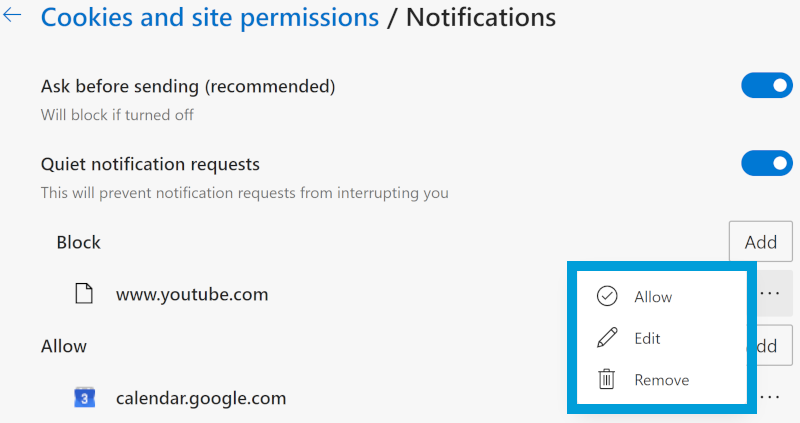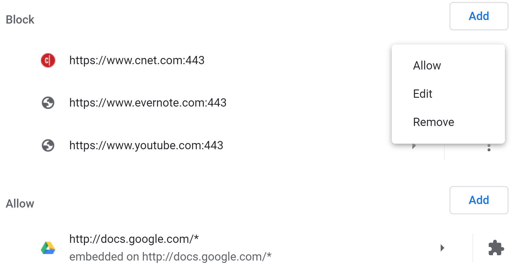 In either section, click the Add and enter a website in the pop-up field, then click Add again. To edit the status of a blocked or allowed website, click the three vertical dots to the right of it.