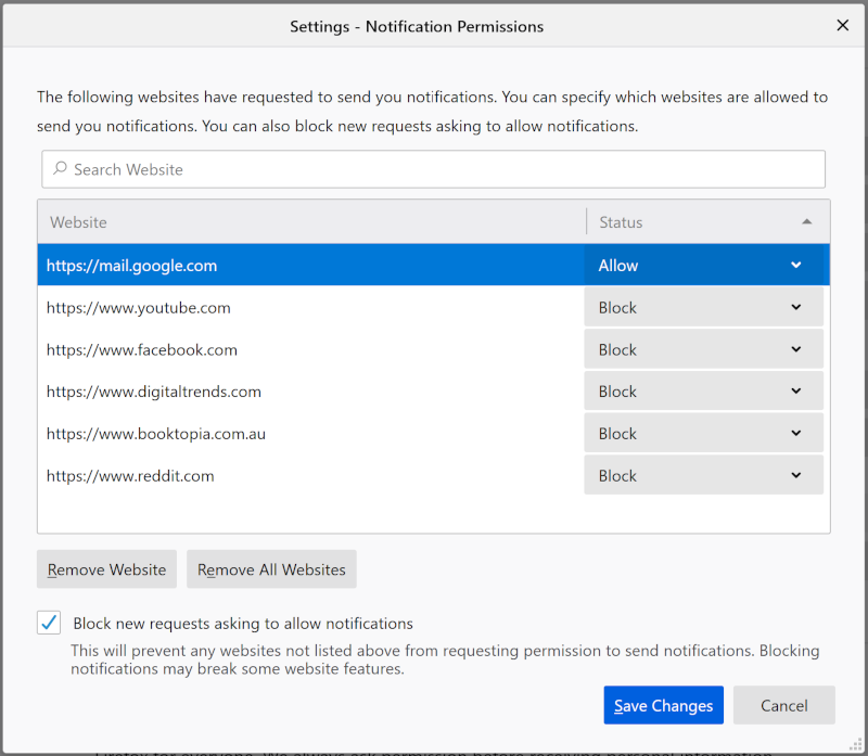 You can switch a website’s status between blocked and allowed using the drop-down to the right of its URL. Or you can remove it from the list altogether by single-clicking on the URL and then clicking Remove Website. Don’t forget to click Save Changes on your way out.