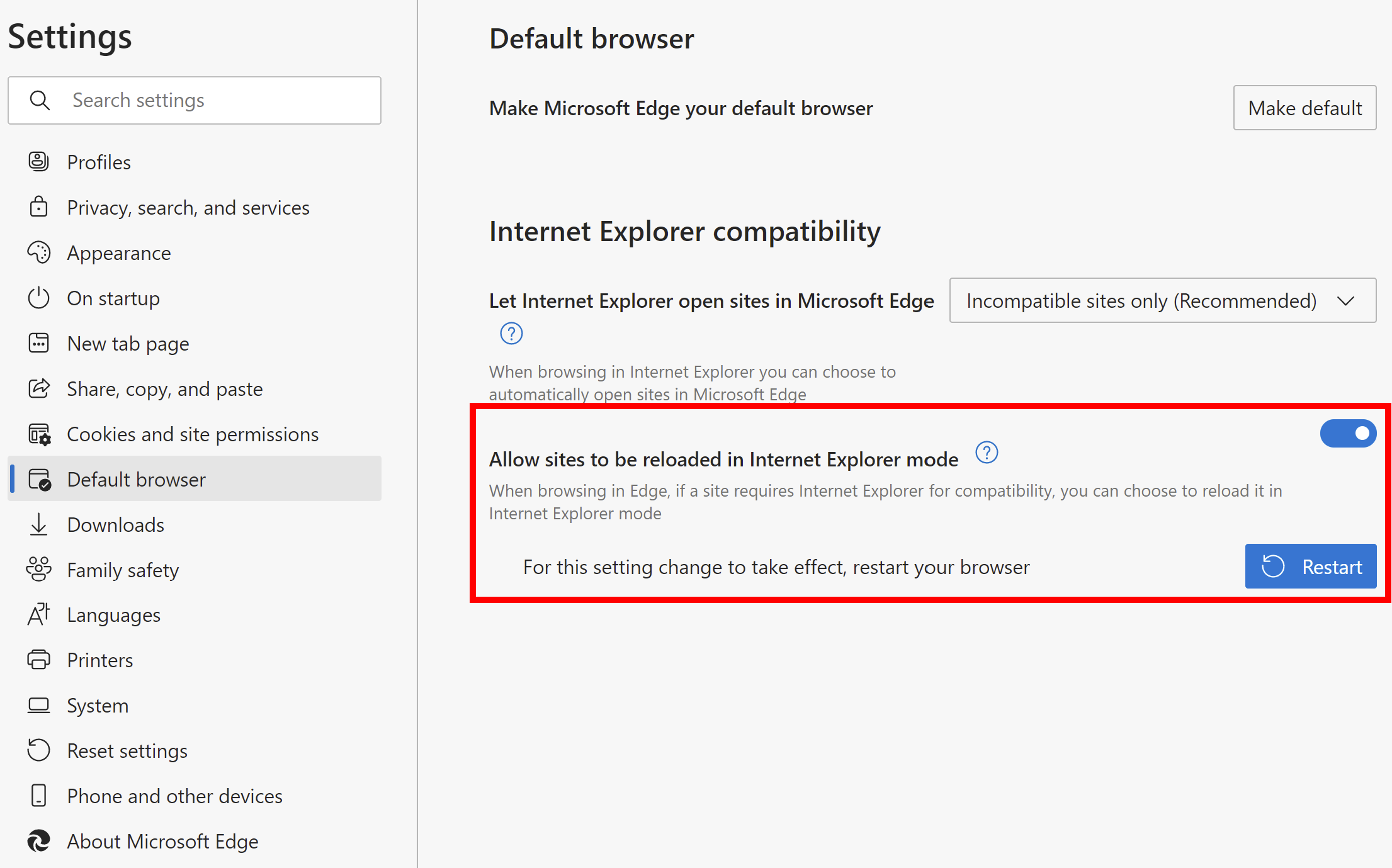 Open Edge and click the icon in the top and select Settings. Click Default browser on the left and enable Allow sites to be reloaded in Internet Explorer mode by clicking the slider next to it and then restarting the browser when prompted.