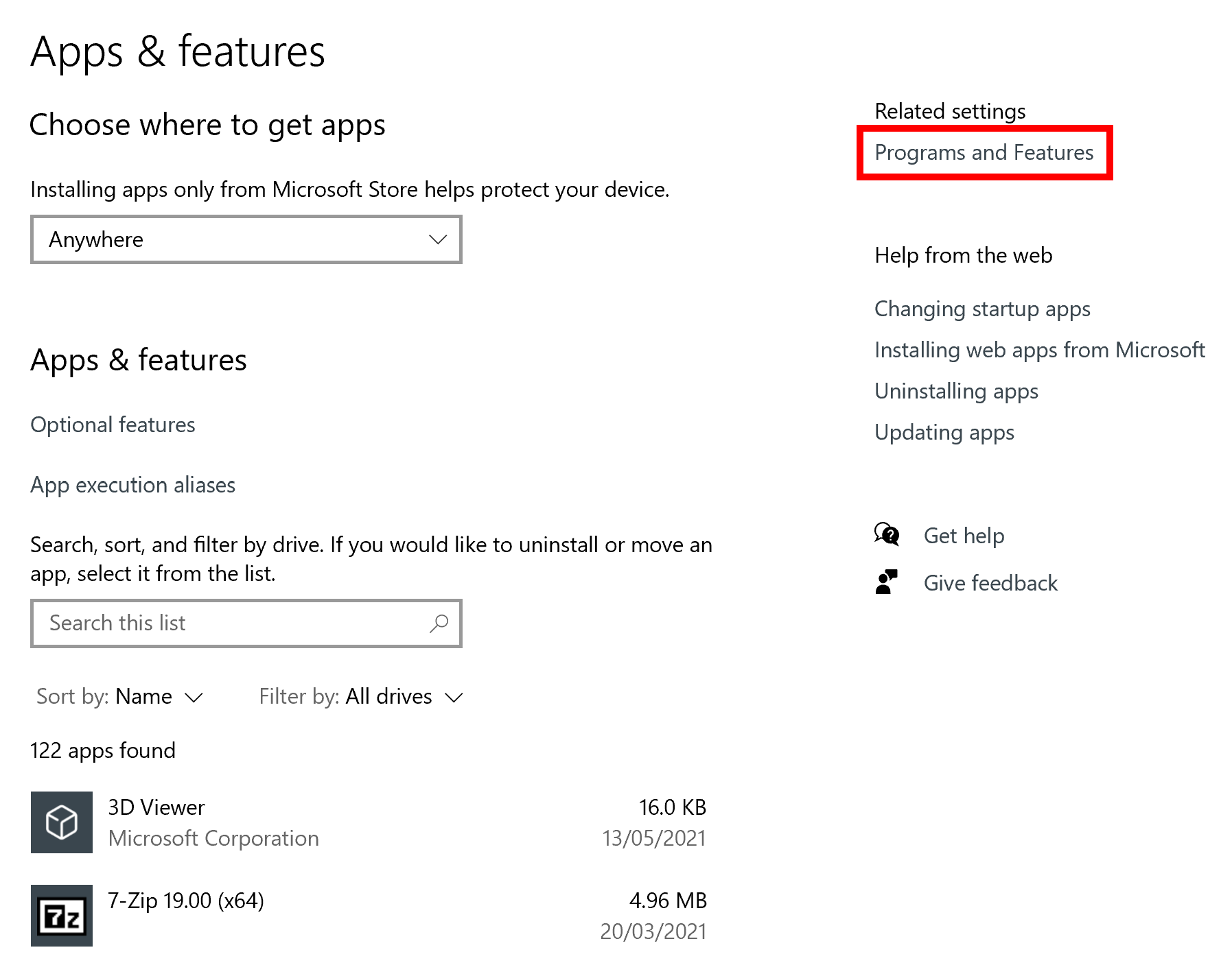 Go to Settings > Apps, and then on the left select Apps and features. On the right-hand side, click Programs and Features under “Related settings”. If you can’t see this option, expand the window.