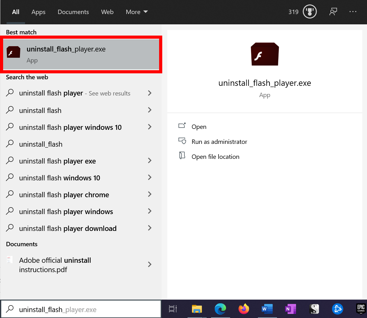 To run the uninstaller, go to your default downloads folder (most likely Quick access > Downloads) and double-click on the file uninstall_flash_player.exe. If you can’t find the file in your Downloads folder, press the Start key and type “uninstall_flash_player.exe” to locate it.