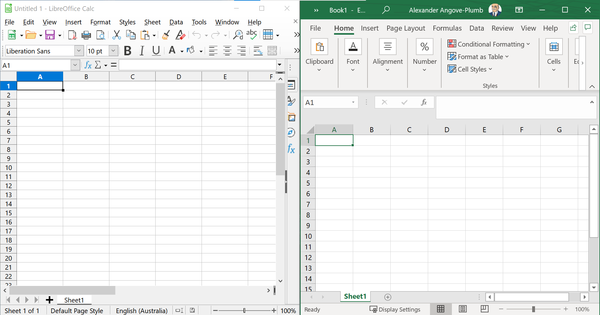 The user interface of LibreOffice Calc (left) is very similar to Microsoft Excel (right).