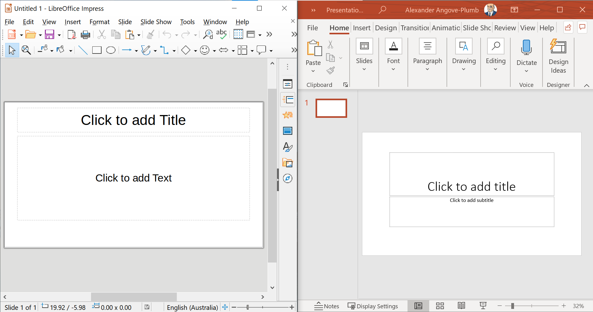 LibreOffice shows little difference to its Microsoft counterpart: LibreOffice’s Impress (left) vs Microsoft PowerPoint (right).