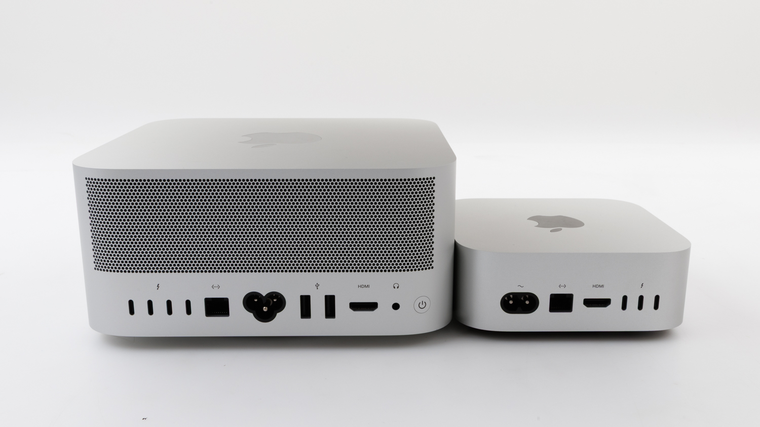 The Mac Studio (left) has an additional USB-C port, two USB-A inputs and a headphone jack.
