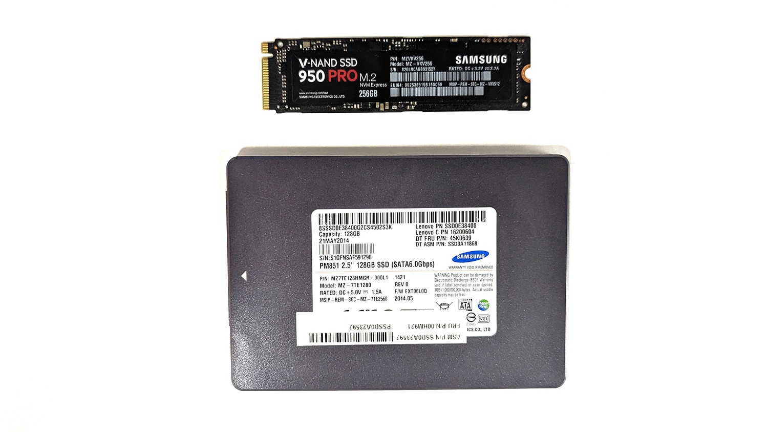 M.2 SSD (top) and a 2.5-inch SATA SSD (bottom) storage drives.