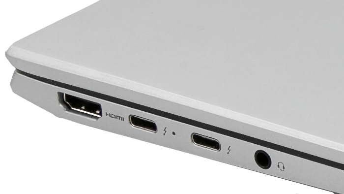 Two Thunderbolt ports and a full-sized HDMI port plus headset port on the left.