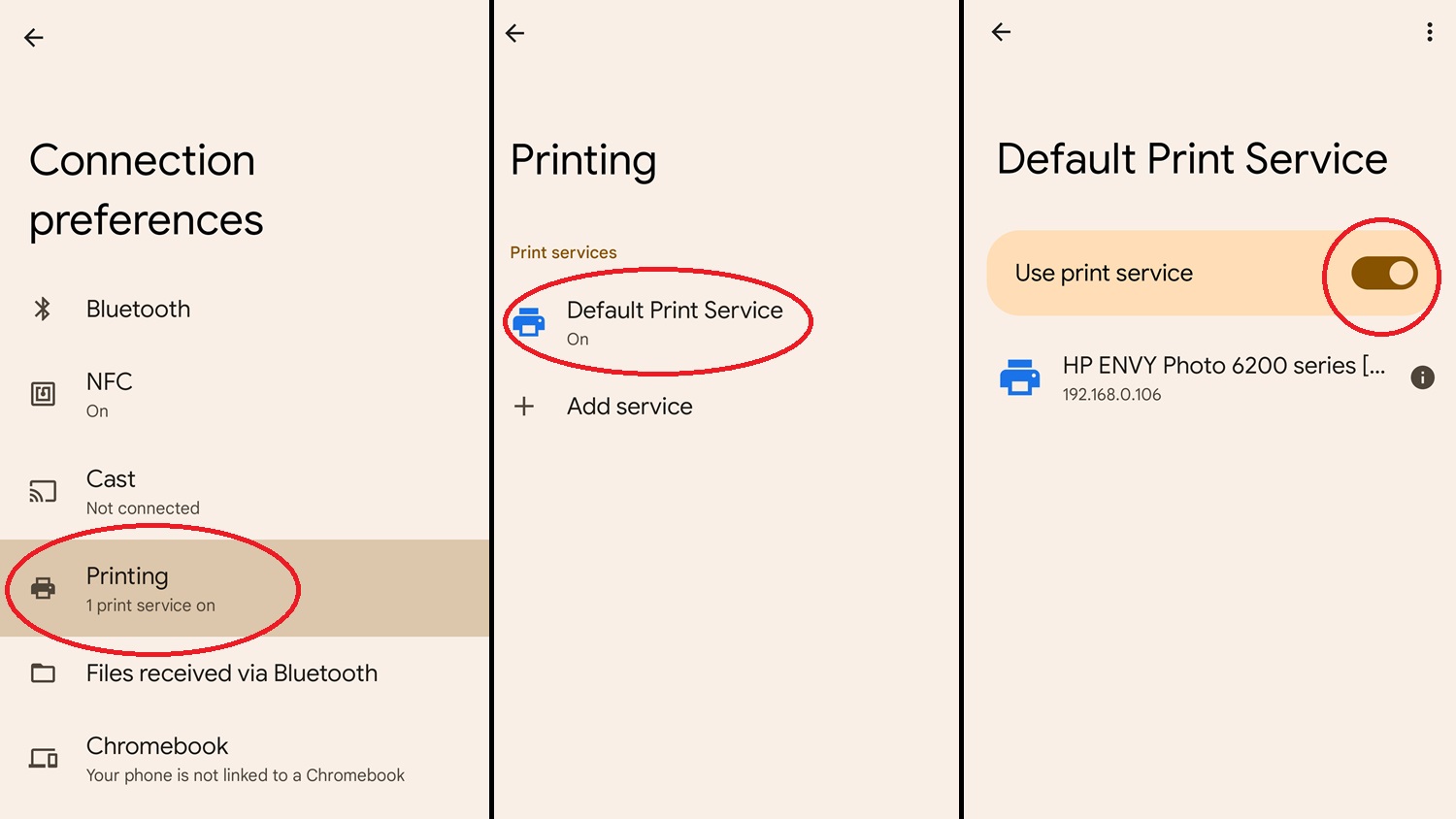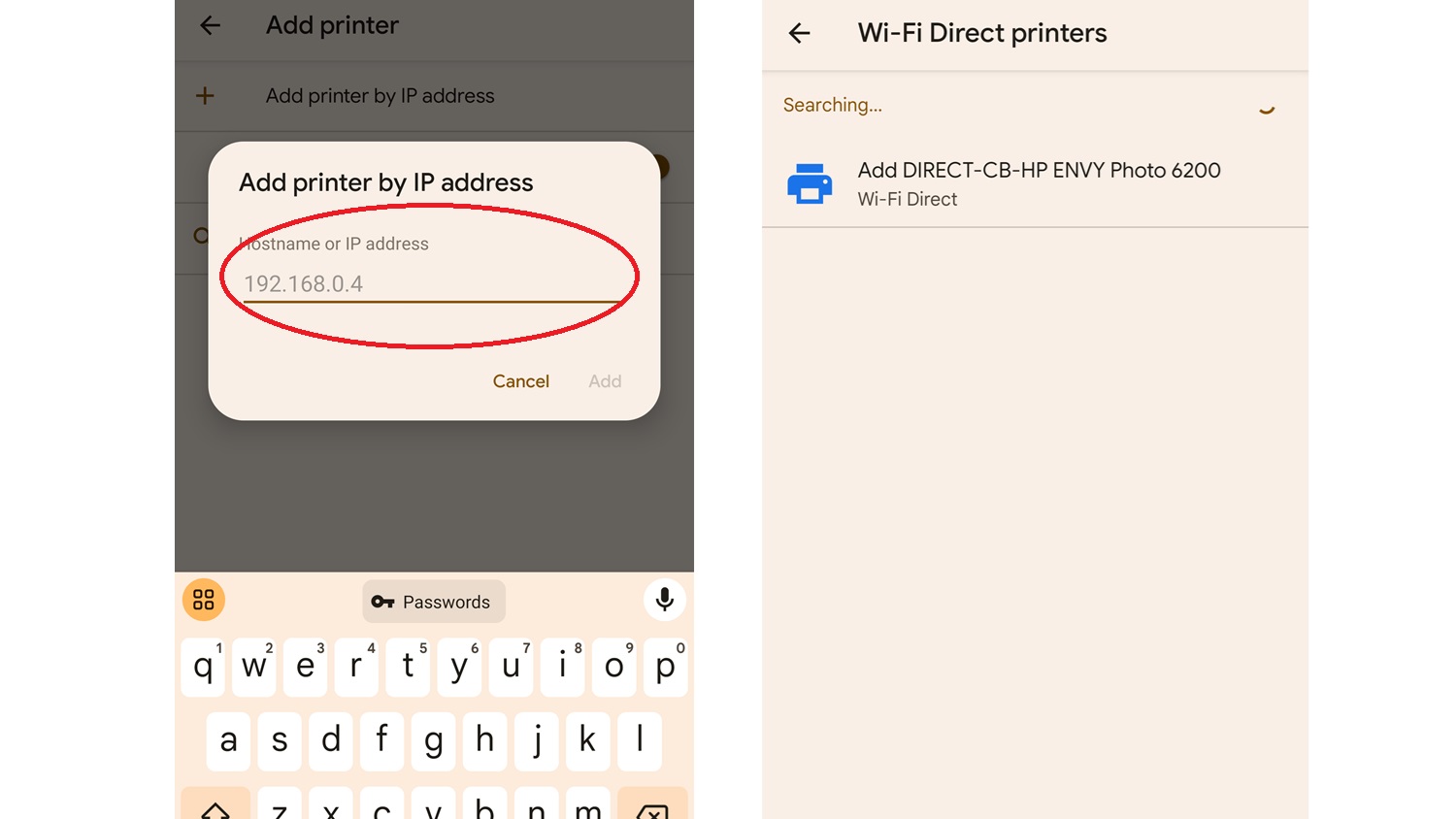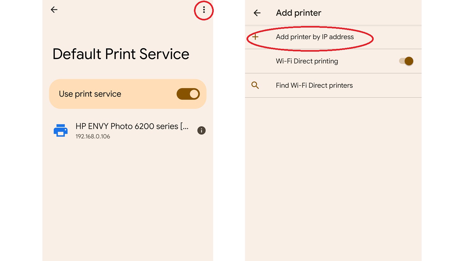 Tap the three dots in Default Print Service to manually add your printer.You can enter the printer’s IP address (left) or select it from the list of Wi-Fi Direct enabled models near your location (right).
