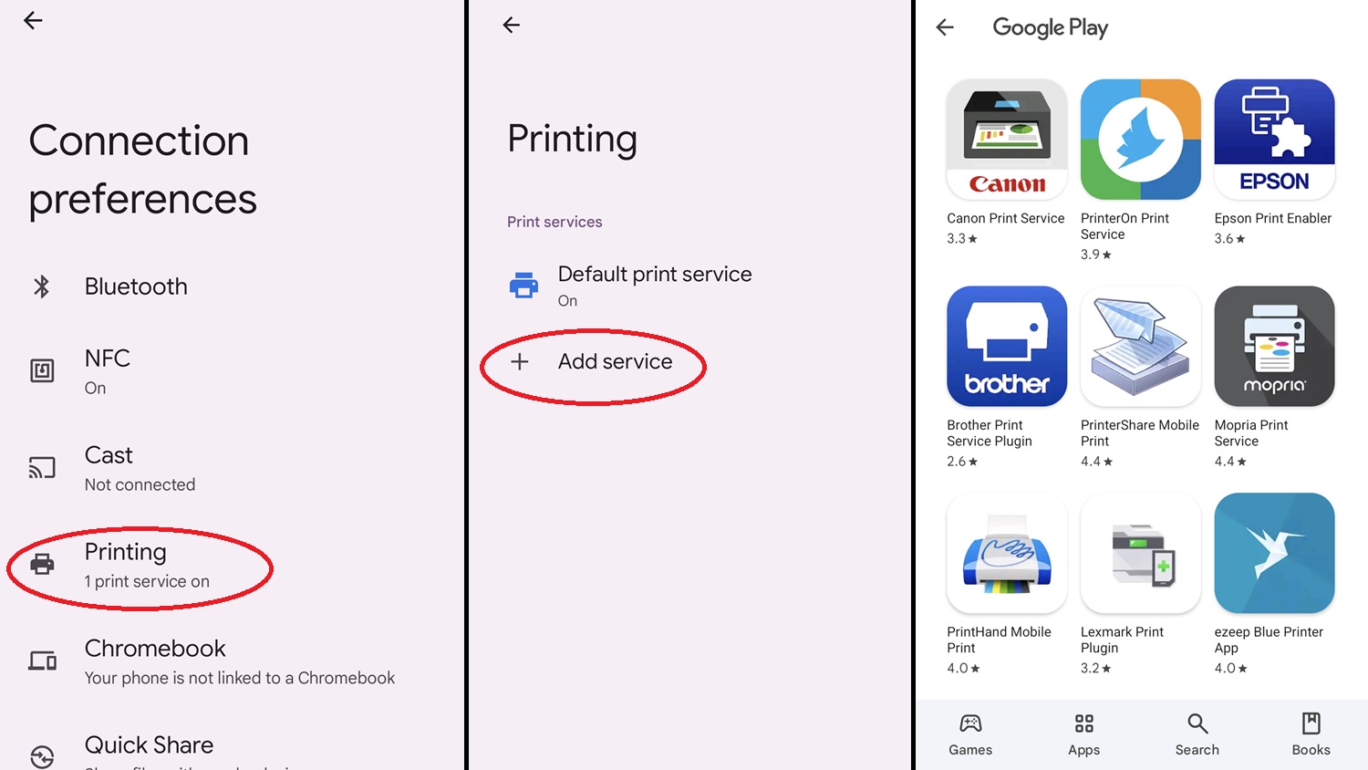 To connect your phone via the Default Print Service, go into the phone’s settings, search for “printing”, then select it from the results. Next, tap Printing in the list of Connection preferences, select Default Print Service and turn it on. A list of compatible printers on the network should appear. Select yours from the list.