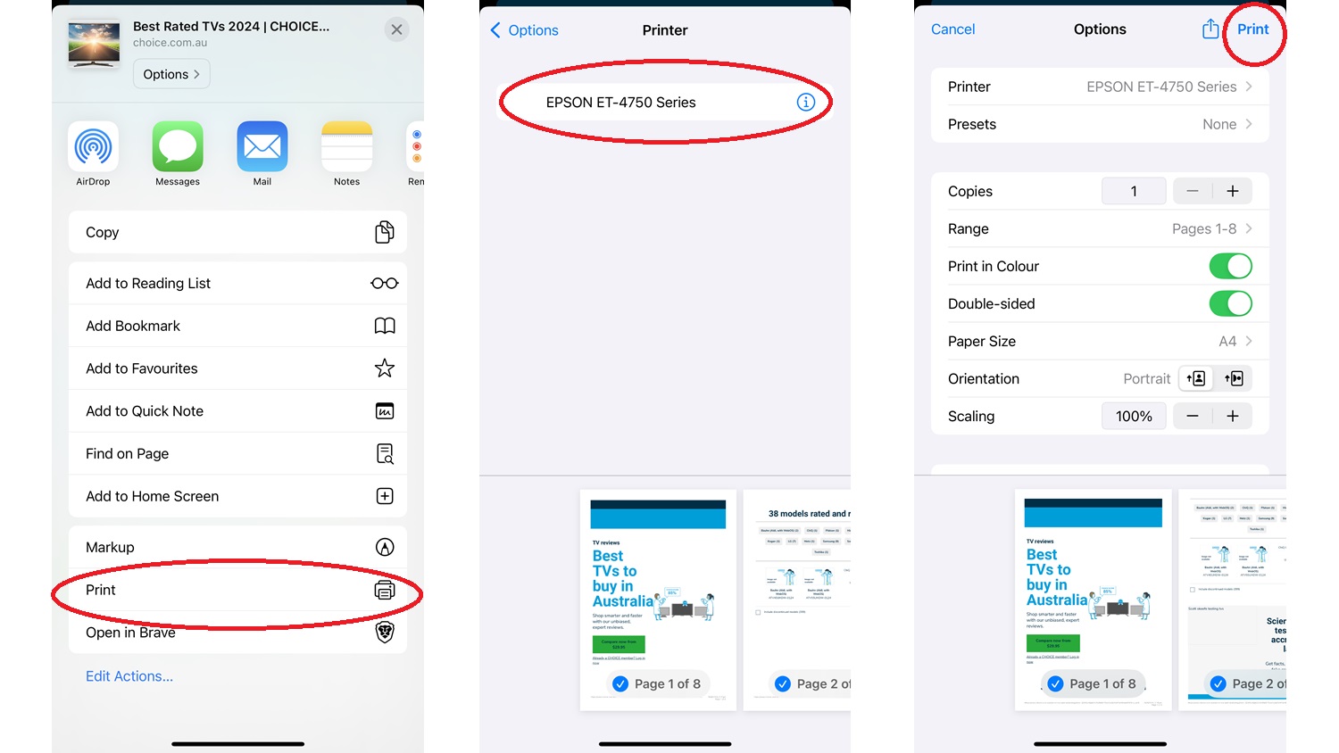 Open the document, photo or webpage that you’d like to print from on your iPhone or iPad and tap the share icon (a square with an arrow pointing up). This will open the sharing options. Scroll down and select Print to open Printer Options.