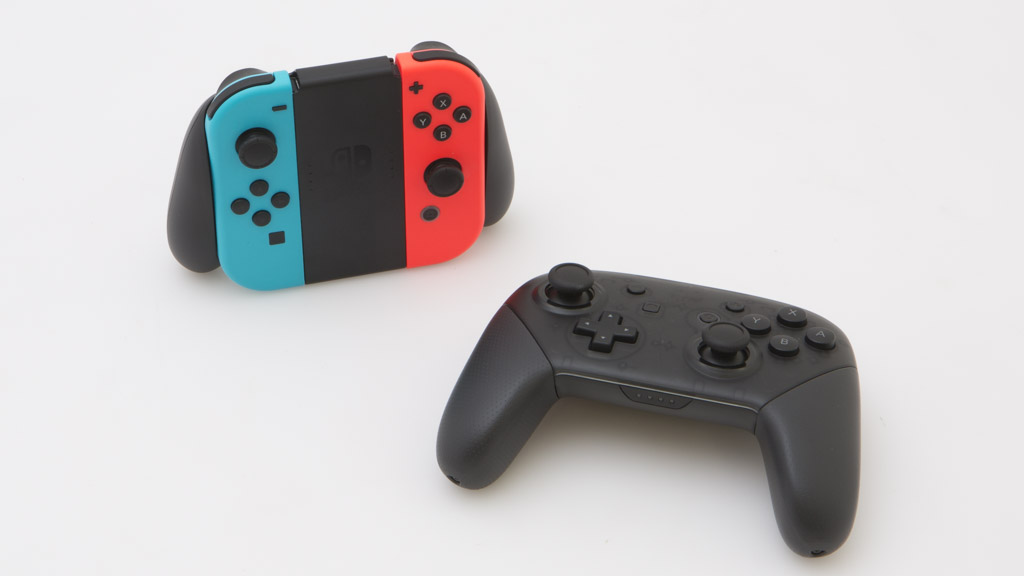 The Switch Pro Controller (right) compared to Joy-Cons in the grip (left).