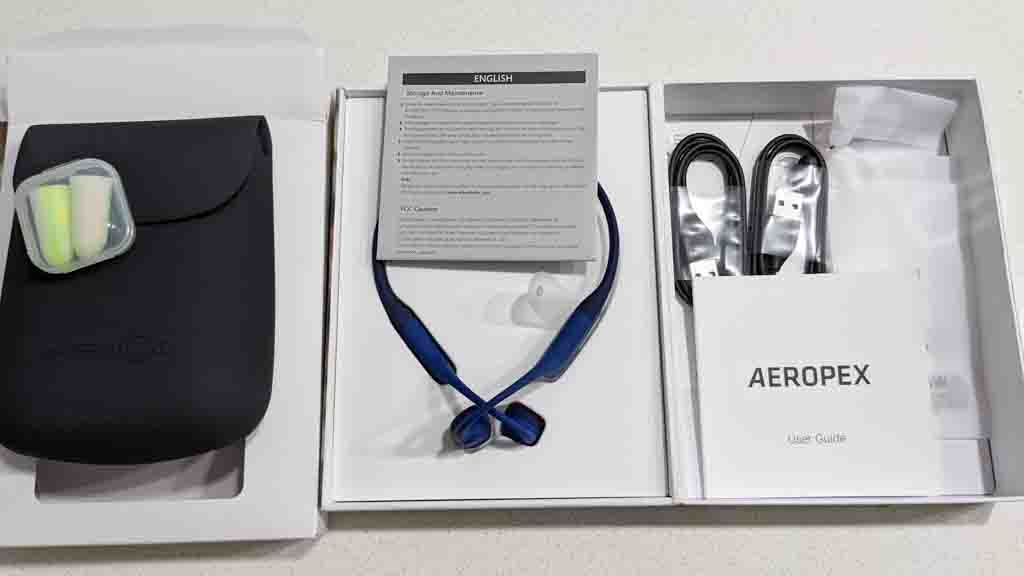 Package contents of the AfterShockz Aeropex wireless bone conduction headphones.