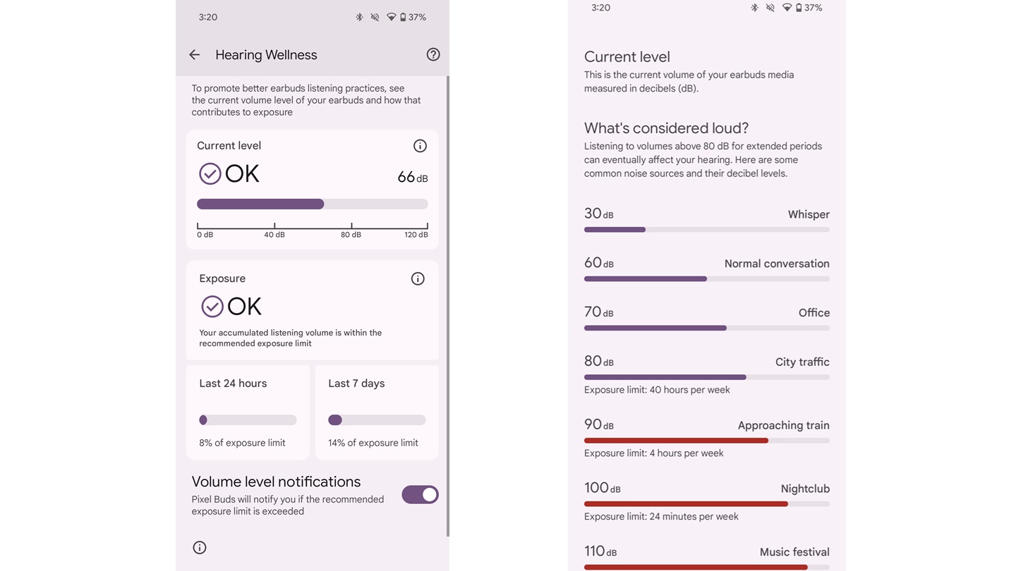This is an excellent addition to the Pixel Buds Pro, especially daily and weekly tracking as people only tend to consider how temporary high decibel bursts can affect our hearing. The data is clear, concise and easy to understand.