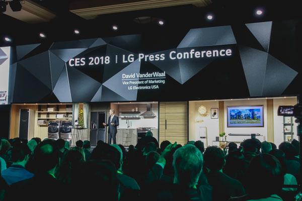 LG also showcased how 2018 ThinQ-enabled products can be integrated into everyday life. A smart fridge with a 29-inch display, for example, could be used to search for recipes online. Once a recipe is selected, the fridge sends the temperature details to the oven so it automatically preheats. Or, you can tell the washing machine that you’re going to the gym at 11am, and it will automatically set the appropriate cycle to ensure your clothes are dry and ready in time for your workout.