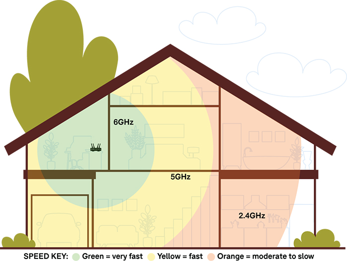 Wi-Fi is broadcast on up to three bands, which are measured in gigahertz (GHz). These are 2.4, 5 and 6GHz. Bands at the lower end of the spectrum have slower speeds/less bandwidth but greater range (meaning they can reach further distances), which inverts as bands move up the spectrum.