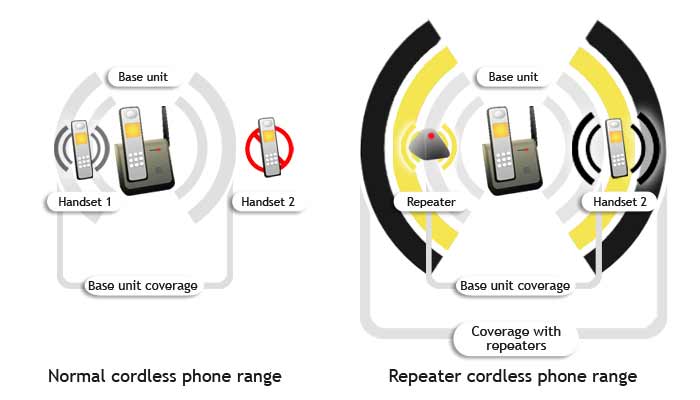 In an effort to extend cordless phone coverage, some companies have introduced ‘repeating technology’ to push the overall phone coverage beyond the limit of the main base station.
