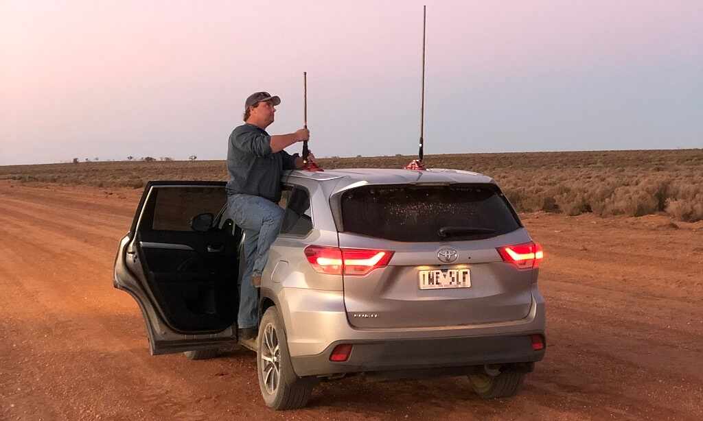 Reception detection – Farming Ahead engineer Josh Giumelli attaches antennas to the roof of a vehicle on the NSW test track.