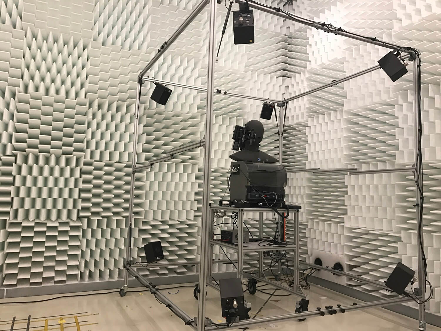 Conducting an acoustic test of call clarity in an anechoic chamber.