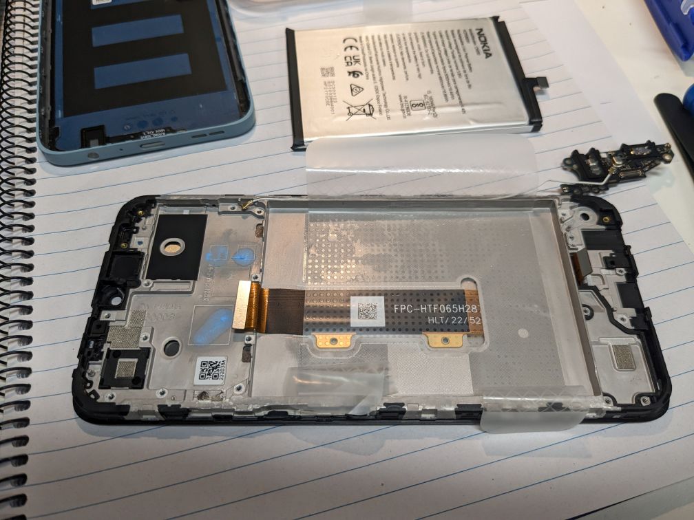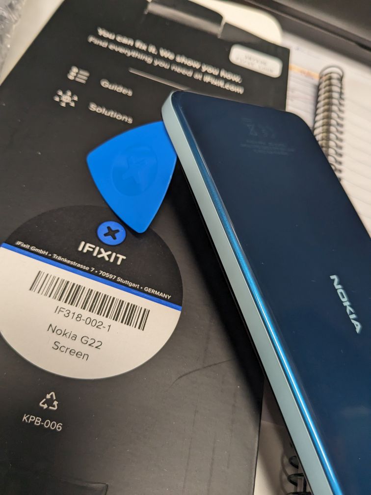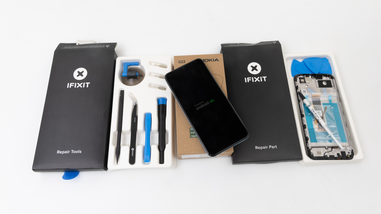Repair kit from iFixit, the Nokia G22 and the replacement part.