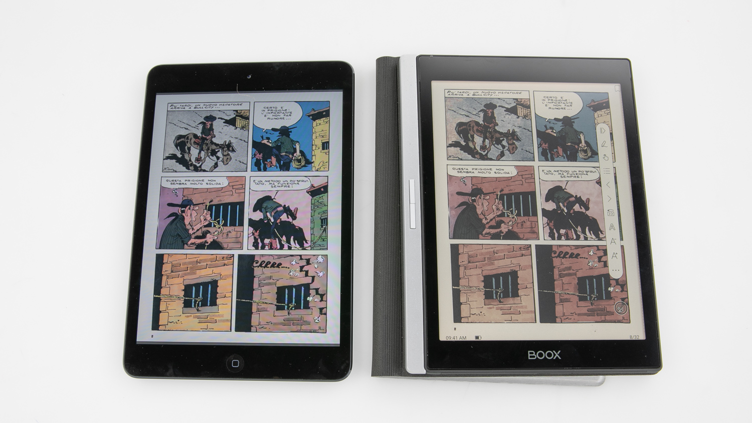 The same page shown on the glossy screen of an Apple iPad (left) compared to the Onyx Nova Air C (right). The Nova Air C’s e-ink screen delivers a more ‘comic’ look.
