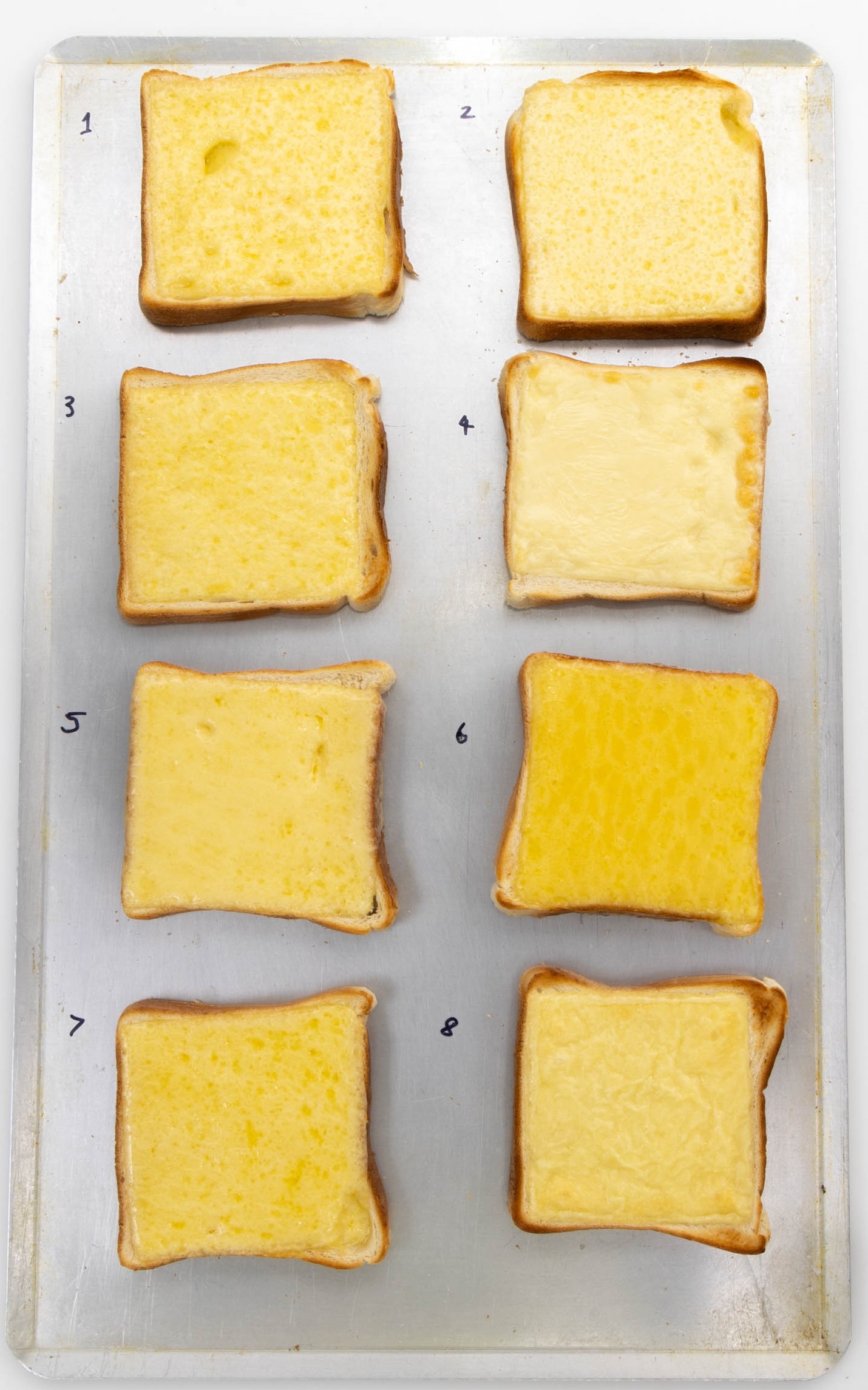 Most cheeses leak melted fat that you can see if you look very closely at our picture of the grilled cheese samples.