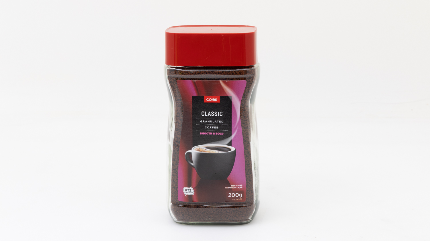Coles Classic Granulated Coffee Smooth & Bold, score 80%, price per 100 grams $1.85.