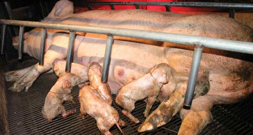 Less well known is that sows are routinely moved to narrow steel farrowing