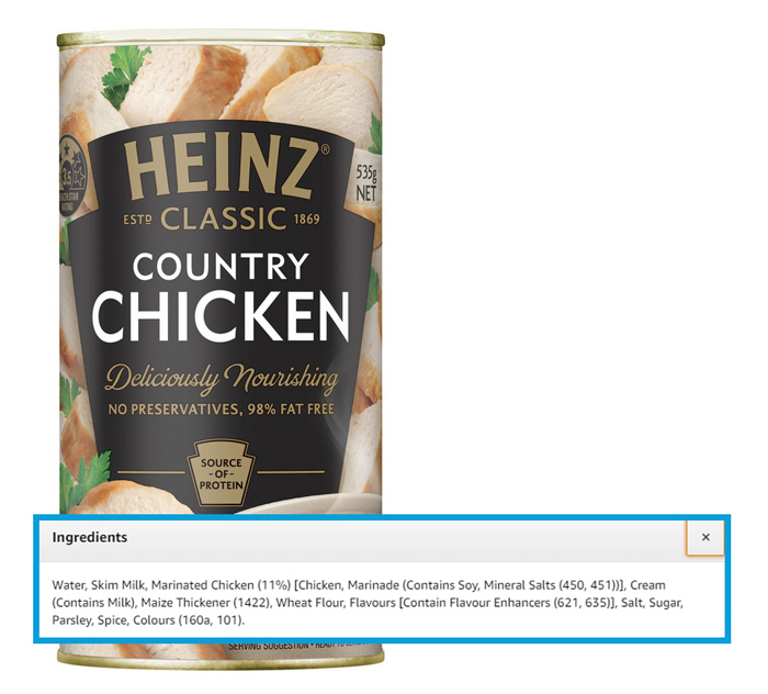 Food additive monosodium glutamate (MSG) is another example. MSG has a bad reputation for triggering asthma in some people, and as a result many people actively avoid it. Manufacturers can (and often do, as per this chicken soup, pictured) instead choose to label it as ‘flavour enhancer 621’, which is arguably less identifiable and therefore not as likely to sound alarm bells.