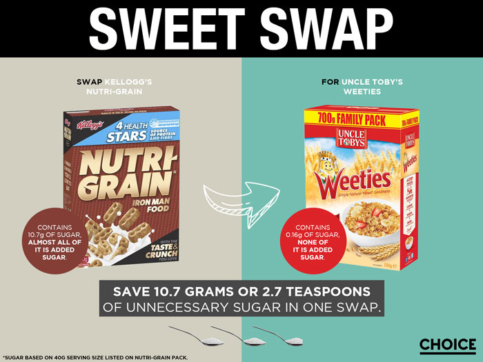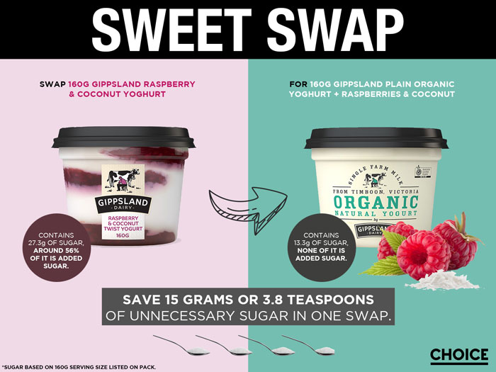 Labels that clearly identify the amount of added sugars in food would enable Australians to make informed choices about which products to buy, and help them reduce the amount of added sugar they’re consuming. To demonstrate, we’ve determined the added sugars hiding in some commonly eaten items, identified lower sugar alternatives and calculated the added sugar savings to be had if you swapped what you eat.