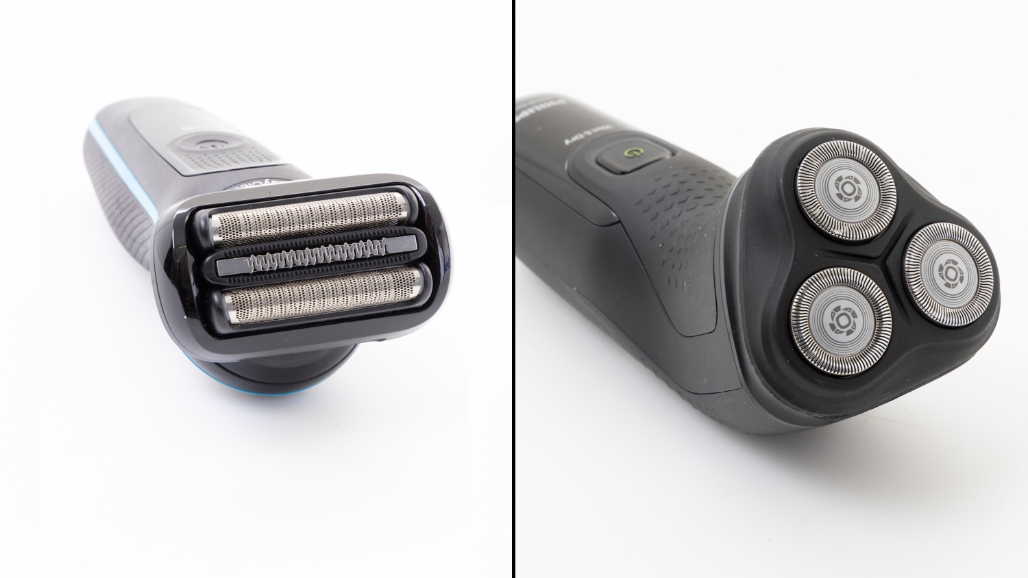 Foil shavers (left) have oscillating blades beneath a perforated foil, and rotary shavers (right) use rotating heads to lift and cut the hair.