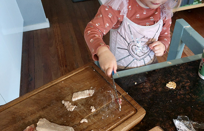 The next day was my day off work, which I spend with my two-year-old daughter. Like any normal toddler, she loves helping mummy with whatever the day brings. And on this day, I handed her a child-safe kiddy cutter and a slab of beef fat and told her to get cutting.