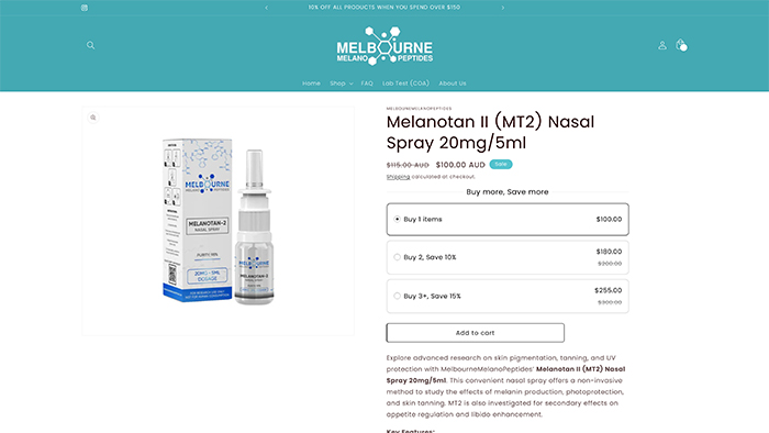 A simple online search reveals several sites selling tanning nasal sprays in Australia. Some sites are unclear on whether the products they are selling contain Melanotan I or II; however, some explicitly state on their website that their tanning nasal sprays do contain some form of Melanotan.